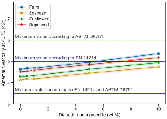 The kinematic viscosity of diacetinmonoglyceride is significantly higher than that of triacetin. Its addition to biodiesel compromises compliance with the maximum limit set by EN 14214 standard [8] of 5 cSt. The more unsaturated types of biodiesel (soybean and sunflower) are less affected thanks to their lower starting viscosity. Concentrations of up to 10% by weight of diacetinmonoglyceride can be maintained in them without compromising the quality of the final biodiesel. It should be noted that the approximate content of diacetinmonoglyceride is 5% by weight when the optimum molar ratio of methyl acetate/oil of 48:1 is used in the interesterification reaction [1,2,28]. Therefore, although larger amounts are studied in this work, they will never be found in practice.