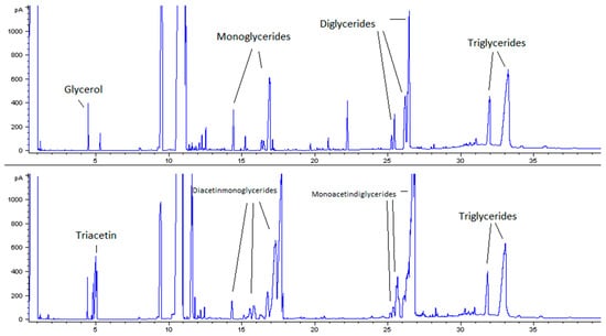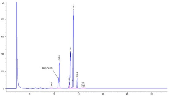 Chromatogram obtained according to EN 14103 [16] standard. Diacetinmonoglyceride was not detected with this test.