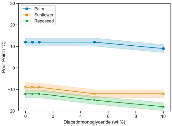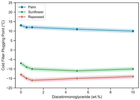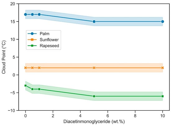 In Figure 6, the cloud point for biodiesel–diacetinmonoglyceride blends for rapeseed, sunflower and palm oil is shown. It can be observed that the addition of diacetinmonoglyceride causes a decrease in the temperature at which freezing begins. This reduction in CP is greater for rapeseed (from −3 °C to −6 °C) than for palm oil (from 17 °C to 15 °C), at diacetinmonoglyceride concentrations greater than 5% by weight. For sunflower biodiesel, the diacetinmonoglycerides do not affect its cold behavior.