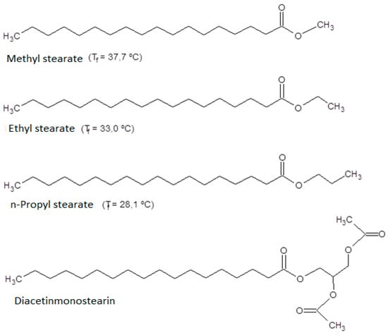 In Figure 7, the structures corresponding to methyl, ethyl and n-propyl stearate are shown, along with their melting points [33]. Alongside them, the diacetinmonoestearin (the diacetinmonoglyceride of stearic acid) is also shown.