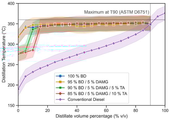 Distillation curve of biodiesel (BD), conventional diesel and biodiesel (BD)–diacetinmonoglyceride (DAMG)–triacetin (TA) blends (expressed as weight percentage). BD and DAMG were obtained from rapeseed oil. Shadowed values show uncertainty interval.