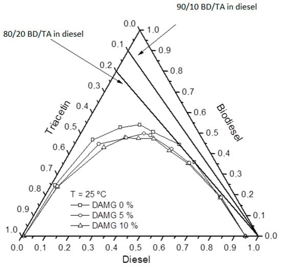 The solubility in conventional diesel is shown in Figure 11. The ternary mixture of triacetin–biodiesel–diesel solubility curve at 25 °C is presented, along with two lines corresponding to biodiesel–triacetin mixtures of 80–20 and 90–10, both expressed in weight percentage, to which diesel is added. These two lines represent all possible mixtures of diesel with the two biodiesel–triacetin mixtures. The results in Figure 11 correspond to rapeseed biodiesel, with no significant differences observed between different types of biodiesel.