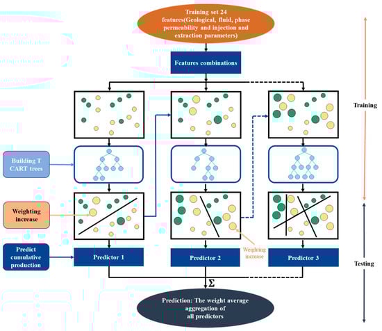 At the current stage, rapidly evolving intelligent algorithms, such as machine learning, have found significant applications in the field of petroleum exploration and development. Sen et al. [] employed a Specialized RNN Unit (SRU) model, which is a type of recurrent neural network (RNN), to optimize the parameters and predict the production in actual CO2-EOR projects. The injection rate, injection pressure, cumulative injection volume of the injection wells, and bottom hole flowing pressure of the production wells were used as inputs for the SRU model, while the fluid production of the production wells served as the output. Li et al. [] utilized the random forest (RF) regression algorithm to predict the performance of the CO2-WAG technique, including oil well production, CO2 storage volume, and CO2 storage efficiency. The CO2-WAG cycle, CO2 injection rate, and water-gas ratio were identified as the main injection parameters. The prediction results showed a close approximation between the predicted values and the actual values in the test set. The average absolute prediction deviations for cumulative oil production, CO2 storage volume, and CO2 storage efficiency were 1.10%, 3.04%, and 2.24%, respectively. He et al. [] proposed an optimization workflow for CO2-EOR operations based on machine learning methods and heuristic optimization algorithms. Their workflow included a power consumption prediction using a Gaussian process regression (GPR) model, which combines a nonlinear autoregressive neural network with external inputs (NARX) model for oil production prediction and an operational optimization model. The optimization results were significant; the optimization parameters used included the duration of the water/gas alternating injection cycles, the bottom hole pressure of the production wells, and the injection rate of water.
