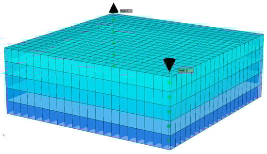 First, based on the actual geological parameters of the oilfield, a characterization model was established, which took into account factors such as well spacing, fluid properties, and heterogeneity. The numerical model consisted of a grid with dimensions of 21 × 21 × 5, with a grid spacing of 10 m in the I direction, 10 m in the J direction, and 5 m in the K direction. Therefore, the feature model had dimensions of 210 m in length, 210 m in width, and 25 m in depth. The well pattern was deployed as a 1/4 five-spot pattern, with one injector well and one producer well per pattern, as shown in Figure 4. The basic parameters of the feature model are described in Table 1.