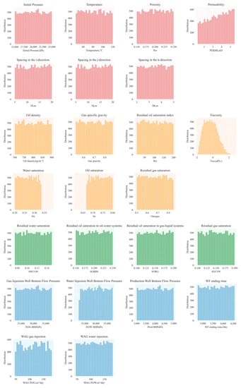 After building the geologic model, a large dataset needs to be generated to train the predictive model built using machine learning. In this study, a numerical model was used to randomly generate cumulative production data for 10,000 sets of geological and completion parameters. This study investigated a total of 24 parameters, including geological parameters, fluid parameters, initial conditions, and injection/production parameters. The parameters included in this study are as follows. The geological parameters included the following: initial pressure, porosity, permeability, temperature, and spacing in the I, J, and K directions. The fluid parameters included the following: oil density, gas specific gravity, residual oil saturation index, water saturation, oil saturation, oil viscosity, and phase mixing parameter. The phase saturation parameters included the following: residual water saturation, residual oil saturation in the oil-water system, residual oil saturation in the gas-liquid system, and residual gas saturation. The injection/production parameters included the following: gas injection well bottom flow pressure, water injection well bottom flow pressure, production well bottom flow pressure, WF ending time, WAG gas injection rate, and WAG water injection rate. The range of the values for each parameter is shown in Table 2, and the distribution of each parameter is illustrated in Figure 5. The applicable range for each parameter in the table was primarily based on the actual conditions of CO2-driven oil reservoirs in China.