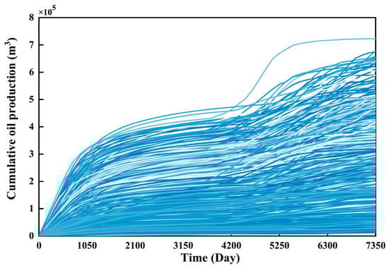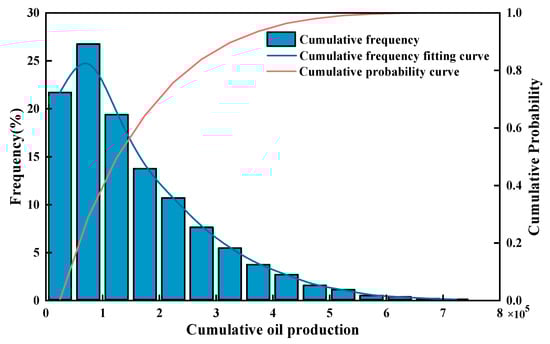 The objective function used in this study was the cumulative oil production, which is the output obtained by simulating the monthly production for each combination using the numerical simulation model. Figure 6 and Figure 7 respectively illustrate the cumulative oil production curve and the distribution of the cumulative oil production. Based on the data and the accompanying figures, it can be observed that the minimum cumulative oil production was 104 m3, while the maximum cumulative oil production was 7.2 × 105 m3. The majority of the distribution fell within the range of 0–105 m3 of oil production.