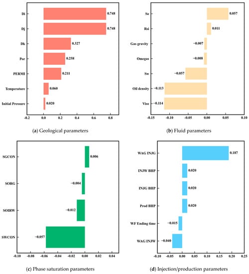 From the perspective of the fluid parameters and phase saturation parameters (Figure 8a,b), there was a weak correlation with the cumulative oil production in CO2-EOR. For instance, in the fluid parameters, the correlation coefficients for the residual oil saturation index, gas specific gravity, and phase mixing parameter were 0.011, −0.007, and −0.008, respectively. Similarly, in the phase permeability parameters, the correlation coefficients for the residual gas saturation, residual oil saturation in the oil–water system, and residual oil saturation in the gas–liquid system were 0.006, −0.004, and −0.012, respectively. These correlation coefficients being close to zero indicate that there is a weak linear relationship between the phase permeability parameters and the cumulative oil production in CO2-EOR.