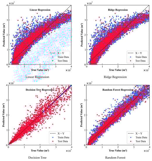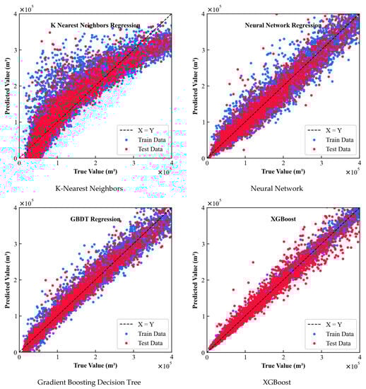 Figure 9 presents the scatter plots of the predicted results versus the true results for the eight predictive models investigated in this study. The corresponding coefficient of determination (R2) values for the selected predictive models are shown in Table 3. Among them, the linear regression, ridge regression, K-nearest neighbors, and decision tree models exhibited scattered predicted points and true points around the 45-degree line, thereby indicating poor predictive performance, with test R2 values of 0.95, 0.81, 0.79, and 0.91, respectively. In contrast, the extreme gradient boosting (XGBoost) model showed a concentration of predicted points and true points along the 45-degree line, with a high test R2 value of 0.98, thereby indicating a low error and good predictive performance.