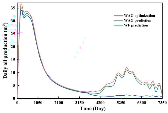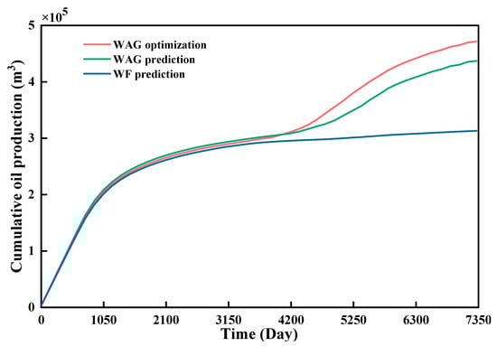 By optimizing these parameters, the final optimization results were obtained, and they are shown in Table 6. Figure 11 and Figure 12 illustrate the optimized cumulative oil production and daily oil production, respectively. From the figures, it is evident that the cumulative oil production and daily oil production under the CO2-WAG method were significantly higher than under the WF method. This finding indicates the immense potential of CO2-EOR technology in improving oil recovery. The optimized cumulative oil production successfully increased from 425,916 m3 to 475,047 m3. This implies that, by optimizing the operational parameters, the oil production potential of the reservoir can be further enhanced.