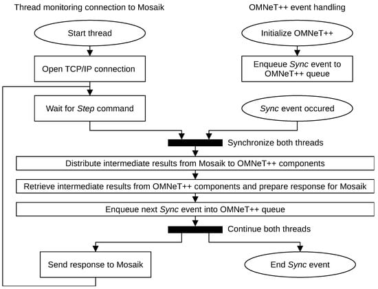 Generally, OMNeT++ can be integrated with Mosaik via a TCP/IP interface. Their clocks can be synchronized following the approach from Figure 2. First, a Sync event is scheduled by OMNeT++ for the simulation start time, and a thread connecting to Mosaik via TCP/IP is launched. The thread is blocked repeatedly, waiting for Step commands from Mosaik, which instruct OMNeT++ to continue simulating for some interval . To achieve clock synchronization, the thread executing Step is blocked until the Sync event occurs in OMNeT++. Likewise, the execution of Sync is blocked until the Step command is received. After both have occurred, relevant values are exchanged between domain-specific simulators and OMNeT++ components through Mosaik. Another Sync event is scheduled by OMNeT++ to be executed in time, when the next Step will arrive from Mosaik. The thread and event scheduling in OMNeT++ continue to run concurrently, while the response is sent back to Mosaik, finishing the current Step command.