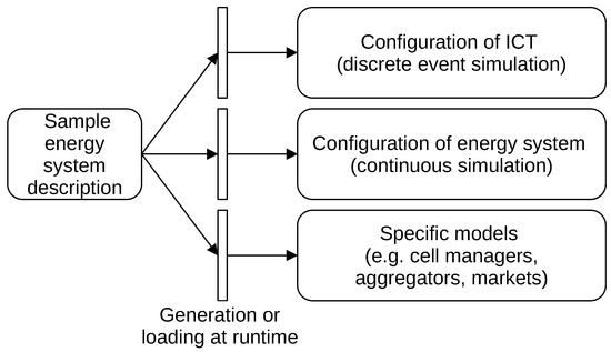 The cellular energy system must be consistently represented in all domain-specific models. This covers the existence and properties of all components, whose parts are represented in different models, including their assignment to cells and aggregators. Therefore, a common sample energy system description must be used for the configuration of all domain-specific models, as shown in Figure 3. It must include details of all energy system components, e.g., power lines, gas and district heating pipes, together with their parameters. The energy system model can be generated from this description by instantiating components from a library, such as TransiEnt. The ICT model can be similarly configured based on the libraries of proxies, protocols and ICT components. The sample energy system description must also contain the assignment of entities to enable the configuration of cell managers, aggregators, and markets. Components belong to cells, households and generators to aggregators, cells and aggregators to markets.