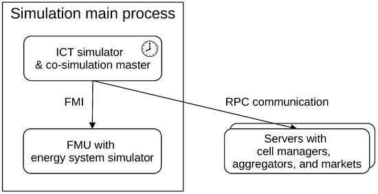 To simplify co-simulation, the ICT simulator can act as a master instead of Mosaik, bringing a number of advantages. First, no synchronization of clocks is needed, as only the clock of OMNeT++ is used. Second, the communication among domain-specific simulators is simpler since they are interacting via the ICT simulator already. Third, integrating FMUs into OMNeT++ is straightforward by using their C interface. This also enables the ICT and energy system simulators to run in the same process, resulting in much faster interactions compared to the inter-process communication. However, additional effort is required to integrate simulators of cell managers, aggregators and markets, which can be achieved via TCP/IP. Finally, the independent development and reuse of existing domain-specific models is promoted.