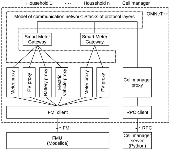 Validated models have to be applied in simulations to obtain credible results. Many validated models exist in the field of smart grids; however, these are based on different paradigms. Communication protocols are generally simulated with event-based simulators, while models of the physics of energy systems are usually based on differential and algebraic equations solved with continuous simulation [34]. Models for markets and market aggregators also require different paradigms for complex calculations and optimization, including machine learning [35]. Combining all these so-called domain-specific models with their different paradigms to simulate the entire cellular energy system necessitates co-simulation.