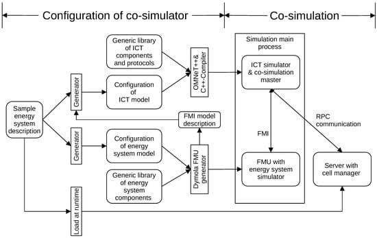 The co-simulation is consistently configured based on a common energy system description stored in a relational database. The description is used to generate configuration files for domain-specific simulators, and is also loaded by the servers for cell managers, aggregators, and markets.