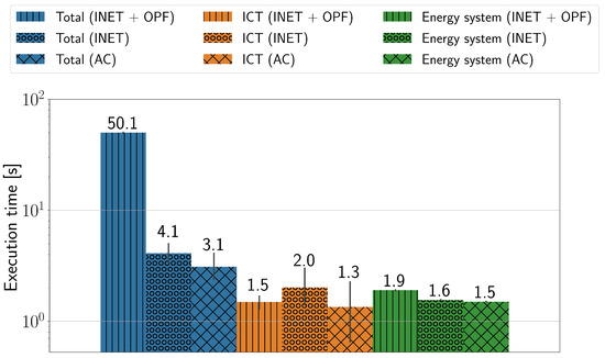 Figure 8 shows the execution times of the energy system and ICT simulation as well as the combined totals for each configuration. The execution time of the cell manager was omitted for conciseness but is discussed below. As visible from the figure for AC and INET configurations, without the OPF cell manager, the execution time is mostly spent on the energy system and ICT simulation. The ICT simulation also includes all operations performed by OMNeT++ as the co-simulation master.