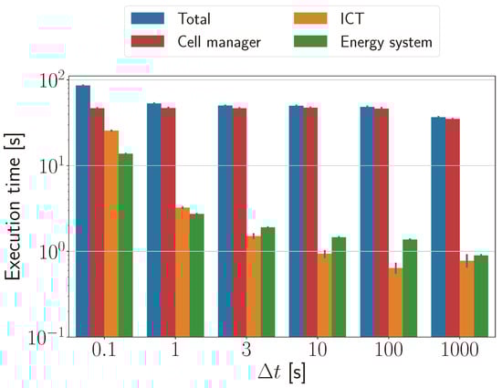 To show the impact of the sampling frequency, the 13-household cell was simulated for different values of . The results are shown in Figure 9. The cell manager performing optimal power flow calculation occupies the major portion of the total execution time, up to 54%. The execution time of the cell manager is not affected by since the latter only influences the frequency of message exchanges between household devices and gateways but not between gateways and the cell manager. With a larger , the execution times of the ICT and energy system simulations decrease non-linearly. Changing from 0.1 s to 1 s speeds up the energy system simulation by 80%, due to fewer function calls from the co-simulation master to the energy system FMU. Contrary to expectation, the cost of these calls also depends on as shown in Figure 10. The ICT simulation runs up to 88% faster with larger due to the reduced number of packets being exchanged between proxies and the lower number of events generated inside the co-simulation master overall. Under a higher sampling rate with 0.1 s, more traffic is generated, and the execution time of an abstract ICT model is much shorter (9.4 s) compared to the protocol-based version (25.8 s).