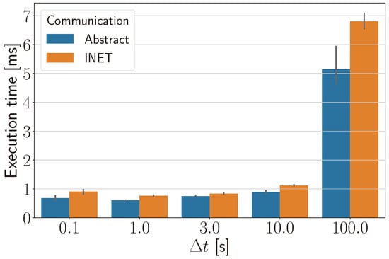 Another factor that determines the execution time is the length of the time intervals between communication points for exchanging values between the FMU (energy system simulator) and OMNeT++. Parameter defines how often values are read from the FMU and forwarded to household gateways. It can be viewed as a sampling rate of the energy system at the gateway. The appropriate value for depends on the required granularity of the energy system control by the cell manager. High values of will result in an outdated view of the energy system at the cell manager, leading to inefficient and unreliable control decisions. With low values of , the energy system can be operated with little to no lag at the cost of a higher traffic overhead generated by each household. In the previous subsections, 3 s was assumed to be an adequate value considering the 10 s periodicity of message exchanges between household gateways and the cell manager.