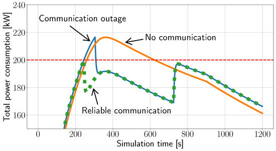 The example in Figure 11 shows three cases, for which the maximum power of the substation bus is assumed to be 200 kW. Without cell manager intervention, i.e., if there is no communication at all, the continuous charging of 5 BEVs on top of the overall cell power consumption leads to an 8% overload on the bus for nearly 400 s. Having reliable communication and all measurements and commands delivered in time prevents the bus from being overloaded. This is achieved by the cell manager reducing the charging power of all 5 BEVs from 6 kW to 0.1 kW. However, if a communication outage occurs at the simulation time 240 s for the duration of 60 s, a cycle of the cell manager commands is lost. As a consequence, the bus gets overloaded again for the same percentage as without cell manager intervention but for a short duration only until the next exchange with the cell manager occurs one minute later.