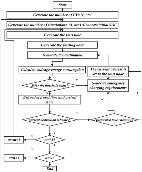 The Monte Carlo method is an approximate inference method to solve problems such as expectation, mean value, area, and integration [41]. According to the characteristics of the spatiotemporal distribution of EVs, EVs can be regarded as particles and cities as a plane. The Monte Carlo method can be used to predict the spatiotemporal distribution of EVs [42]. The Monte Carlo simulation flow diagram is shown in Figure 1. The first step is to generate the quantity of EVs, the number of simulation cycles, the initial state of charge (SOC), the start time, the beginning node, the destination, and to compute the mileage energy consumption. SOC refers to the usable state of the remaining charge in the battery [43]. If SOC is less than the threshold value, an emergency charging requirement is generated and the charging location is taken as the starting node. If SOC is greater than the threshold value, the estimated travel time and arrival time are considered. Second, if the destination is home, start the next cycle or end the simulation. If the destination is not home, the EV owner chooses whether to fragment time charging. If so, no emergency charging requirement is generated; otherwise, it is generated. In reference [44], based on the central limit theorem and travel chain theory, the Monte Carlo method is adopted to simulate the time distribution of charging loads at different functional stations.