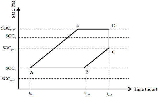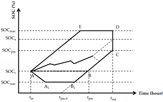 In the scenario of V2G, the EV can be charged and discharged. Compared with the adjustable range of the unidirectional charging EV from ABCDE to AA1B1BCDE, the SOC value of EV should be included in the above area. Line segment B1C still represents the forced charging constraint, and the latest charging time is tpm,d. In Figure 3, line segment AA1 represents the process of EV discharging from SOCt to SOCmin at a rated discharge power after the EV is connected to the network. The slope is the SOC change rate under the rated discharge power.
