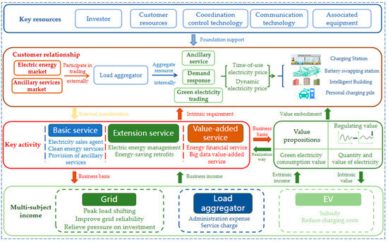V2G is jointly promoted by the government and the power grid, so V2G has strong investors, and with the gradual increase in the number of EVs, it has large customer resources. V2G has high requirements for the response rate, so it has advanced coordination control technology, communication technology, and associated equipment. The above attributes support the operation of V2G. In the V2G model, the load aggregator participates in the ancillary market transactions of the electricity market and the ancillary service market. Within the load aggregator, the load aggregator encourages EV users through time-of-use electricity price or dynamic electricity price, so that EV users can participate in ancillary services, demand response, and green power trading independently, the V2G business canvas is shown in Figure 5.