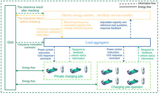 The interaction between EV users, load aggregators, and the grid is shown in Figure 4. The power grid transmits the price information and the compensation information to the load aggregator. According to the travel demand and participation willingness of EV users, the load aggregator enables EV users to adjust their charging behavior through incentives such as the time-of-use electricity price. In this way, it can assist the power grid in reducing the peak−valley difference. The load aggregator uploads relevant information such as power consumption characteristics and load curves in the process of regulation to the power grid. After the adjustment is completed, a transaction settlement is carried out with the EV users and charging stations.