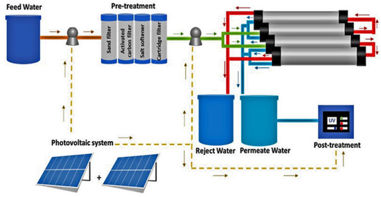- Armendáriz-Ontiveros, M.M.; Dévora-Isiordia, G.E.; Rodríguez-López, J.; Sánchez-Duarte, R.G.; Álvarez-Sánchez, J.; Villegas-Peralta, Y.; Martínez-Macias, M. del R. Effect of Temperature on Energy Consumption and Polarization in Reverse Osmosis Desalination Using a Spray-Cooled Photovoltaic System. Energies 2022, 15, 7787. [Google Scholar] [CrossRef]