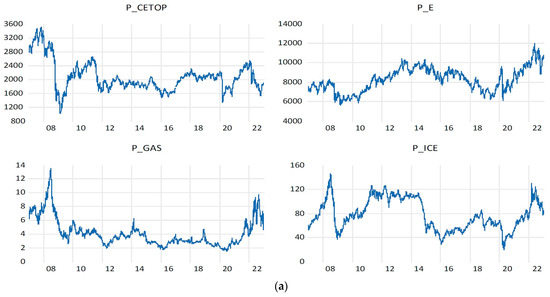 In order to examine the volatility between several energy markets and CEE stock markets, we considered significant data and variables. The data consisted of daily closing prices of several variables from 2 January 2007 to 29 December 2022. Based on representative criteria, the variables were chosen in terms of the most used and most influential commodities nowadays. For CEE stock markets, we used an aggregated index that reflects the performance of the companies with the biggest market value and turnover within the area. In this respect, the variables analysed were the FTSE 350 Electricity Price Return Index (labelled “E” for the electricity market), NYMEX Henry Hub Natural Gas Electronic Energy Future (labelled “GAS” for the gas market), ICE Europe Brent Crude Electronic Energy Future (labelled “Brent” for the oil market) and the Central European Blue Chip Index (labelled “CETOP” for CEE stock markets). We considered this time frame for the data horizon because it comprises several international events that the world has experienced in the last two decades, the financial crisis (2007–2008), the Euro Sovereign Debt Crisis (2010–2012) with the golden age of gas consumption, the COVID-19 pandemic (2020) and the Ukrainian invasion (2022) that has sparked a global energy crisis. The daily prices were obtained from Refinitiv, and the daily return was computed in line with the existing literature [29] as a continuous compounding return using the following formula: Rt = ln(Pt/Pt−1).