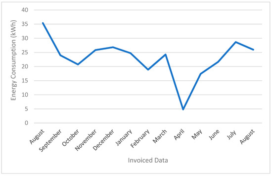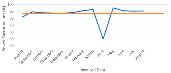 The power factor, with an average of 85.83% (as seen in Figure 1), was also recorded, indicating that it was below the allowed level established by the Federal Electricity Commission (CFE L0000-70) [35]. The energy consumption analysis was recorded with an average reading of 20,440 kWh (as illustrated in Figure 2), aiming to contribute to the improvement of the energy quality.