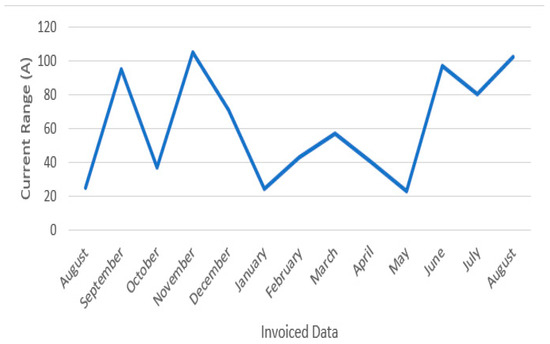 The network analyzer Fluke 434-II [36] was connected to the main power supply board, which provides a voltage of 440 Vac to the load center. In this step, to establish the connection, the network analyzer was configured beforehand with the specific electrical characteristics of the company. The network analyzer is equipped with clamps or amperometric probes and alligator-type connectors. To make the connections, the housing of the load center was first removed. The connection process involved the following steps: firstly, the ground connection was made, followed by connecting the voltage clamps according to their designated colors and lines. Then, the amperometric probes were connected, also following the color and line configurations. Once the connections were made, data recording was initiated using the monitoring feature of the network analyzer. Over a period of one year, the load was connected to the main power supply board, supplying a voltage of 440 Vac to the load center, and was constantly reviewed. During this period, data were generated indicating current fluctuations ranging from 24 A to a maximum of 105 A, as illustrated in Figure 3.