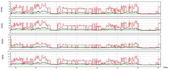 The load is currently connected to the main power supply board, which provides a voltage of 440 Vac to the load center. An analysis of the current in the main power board at 440 Vac has been carried out, revealing current fluctuations across the three phases, ranging from a maximum of 105 A to a minimum of 8 A, as shown in Figure 4. This analysis was carried out over a three-month period. It is important to mention that phase 1 exhibits higher current parameters, while phase 3 displays lower current parameters. It is vital to maintain these fluctuations within optimal values to prevent any significant disruptions in the electrical system of the plant.