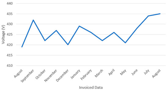 The current fluctuations in the main power supply are shown to range from a maximum of 72 A to a minimum of 8 A specifically in line 1 (see Figure 4 L1 (A)). These fluctuations display irregularity at certain values and exhibit changes in their characteristics over extended periods, particularly when working with equipment that has higher energy consumption [37]. Furthermore, the voltage fluctuations in the main power supply have also been examined. The analysis reveals variations ranging from 420 Vac to 438 Vac, as shown in Figure 5. These voltage fluctuations contribute to a high consumption of electrical energy, which directly affects productivity through increased costs.