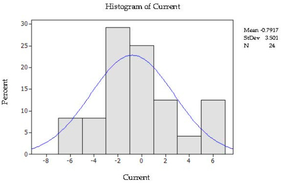 To find the optimal performance and establish a reference for power quality behavior based on the current fluctuations mentioned earlier in the electrical system, a statistical study was conducted using an experimental design with two factors and three variables. This study focused on analyzing the variations in voltage and currents resulting from changes in the powers (active, apparent, and reactive) that cause fluctuations, and an important alteration in the current behavior can be observed (Figure 6) through the histogram representation.