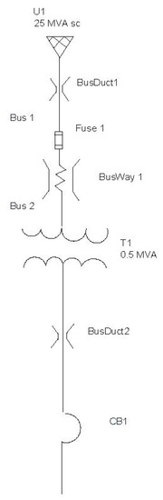 Each of the main data are taken into account by integrating them into each block of the main power supply system connection. These data are obtained from the supplying company (CFE) and include the following: a power rating of 25 MVA, a supply voltage of 13,200 Vac, positive sequence reactance of 2498 + 3123j, and a delta connection obtained from the load flow in the system simulation. Additionally, the conduction and protection elements are integrated, consisting of a copper insulating feeder type BusDuct and a 15 kV fuse with a nominal current of 10 A. Finally, a 500 kVA main step-down transformer is used, with a primary power supply of 13,200 Vac and a secondary voltage of 440 Vac. The impedance settings of the transformer have also been taken into account and included in the data.