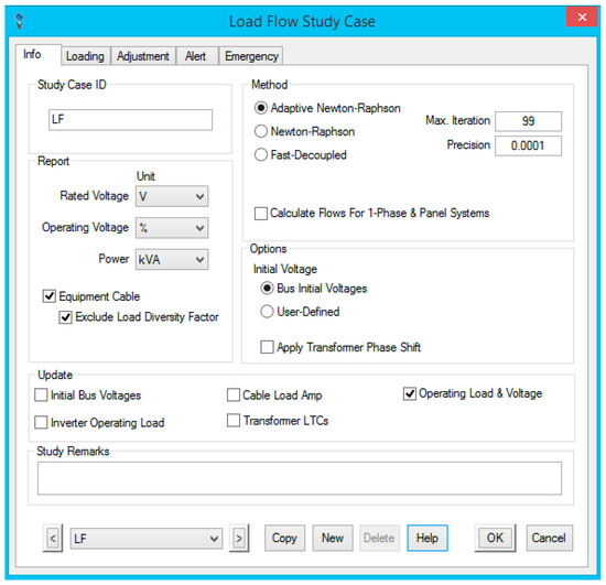 The load flow simulation of the electrical system was conducted using the Software for Analysis and Operation of Electrical Power Systems (ETAP) [41]. This software calculates the voltages at each bus and the power factors for different load types as well as estimates of the current flow for each bus by simulating the flow in each section of the load (Newton–Raphson and/or Gauss–Seidel [42]). Initially, the load flow began in a specific area to provide voltage and power values, as well as the operational percentage at the voltage.