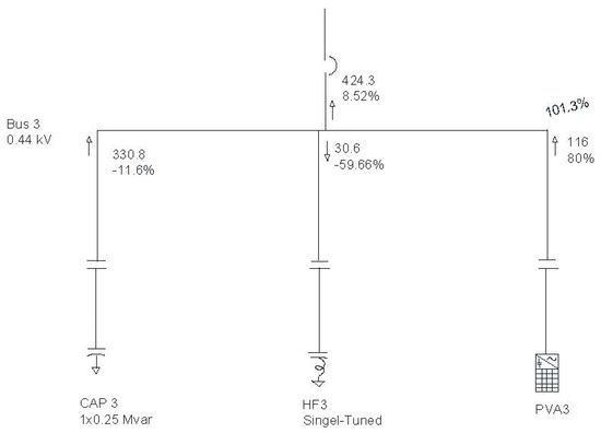 In the system control simulation, both the capacitor bank (CAP3) and the photovoltaic system (PVA3) are energized simultaneously to analyze the behavior of the main variables, as shown in Figure 16a. The data recorded from this simulation were taken into account, showing that on the high side of the main transformer T1, the current is 11.5 A with a power factor of −77.65%; and on bus 4, the recorded data show a current of 344.2 A with a power factor of −75.87%. The formation of the final waveform is regular, as depicted in Figure 16b. The waveforms of the simulation part clearly show that they have higher harmonics.