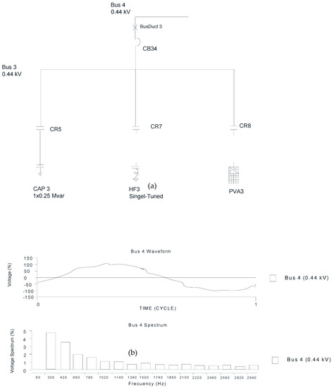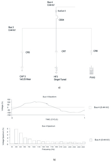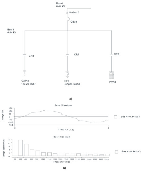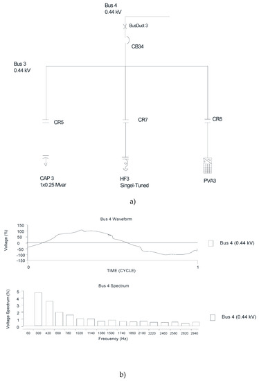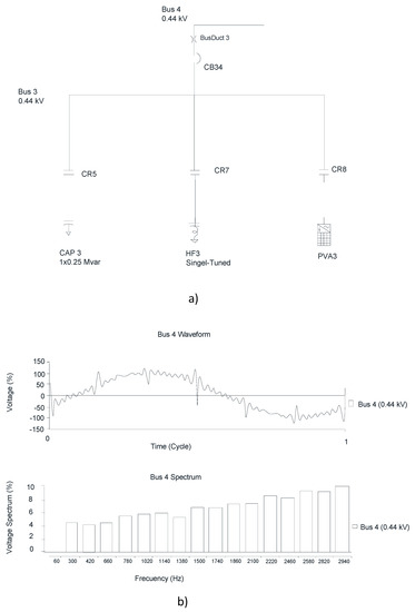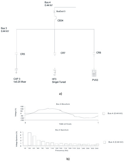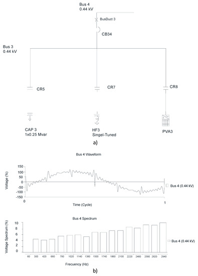 Results of the automation operating the capacitor bank (CAP3) together with the photovoltaic system. (a) Electrical Diagram (b) Spectrum.