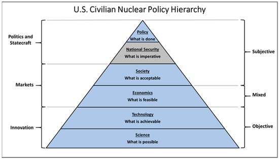 U.S. civilian nuclear policy is framed here as a hierarchy of three broad domains, innovation, markets, and politics/statecraft, thereby spanning from the purely objective laws of science and nature to highly subjective social and political norms and ideals (Figure 1). While the basic sciences and laws of nature dictate what is possible, innovation leverages those laws in the development of technology for deployment within society. Innovation is then constrained by economic feasibility and societal acceptance—if a technology is unaffordable or society rejects it, the technology will not be consumed. A final constraint prior to policy development is national security, which is characterized here as a gray area in the current U.S. civilian nuclear policy debate for reasons that will be evaluated and included in this analysis.