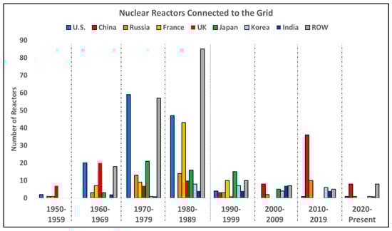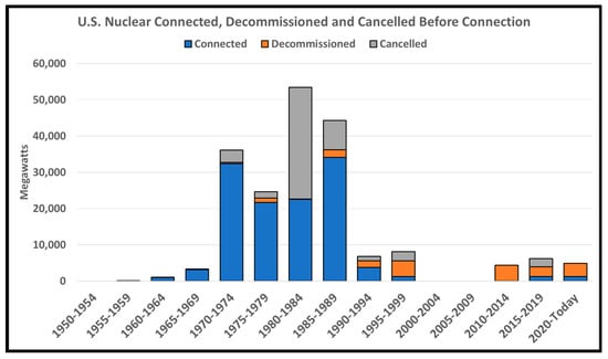 U.S. nuclear reactor activity since 1955. Reactors connected to grid; reactors decommissioned, and reactors canceled after construction began but before connection to the grid [39,40]. (Data Source: International Atomic Energy Agency’s Power Reactor System).