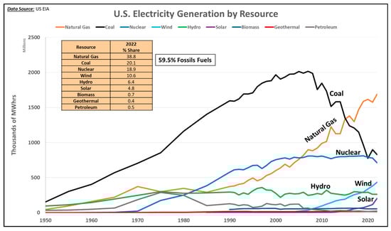 Trend for U.S. electricity generation, 1950–2022 [67].