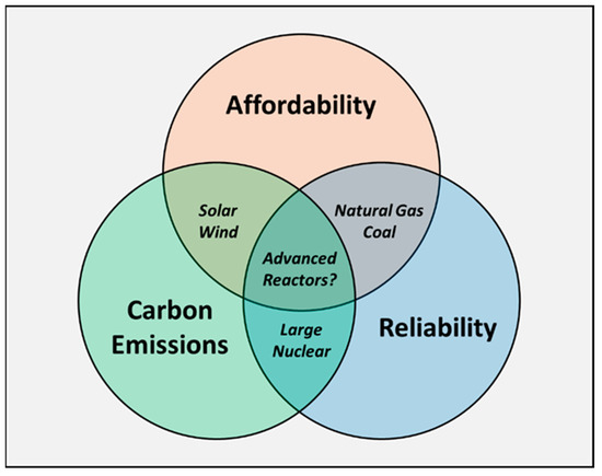 Venn diagram of three key objectives for power generation technologies. Carbon emission, reliability, and affordability. A key question for this paper is, “Can advanced nuclear reactors meet all three?”.