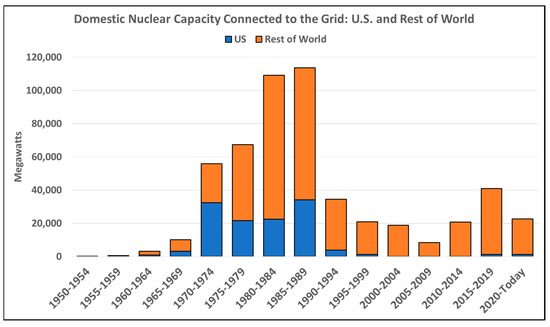The U.S. has transitioned from being the 20th-century global leader in civilian nuclear power, in terms of domestic deployment and global exports, to a nation searching for ways to revive its once-dominant nuclear enterprise [103,116,117,118]. This is particularly relevant given the U.S. civilian nuclear position relative to other countries and the national security implications of that position (Figure 5 and Figure 6). Given the decline in new U.S. nuclear construction, the threat of premature closure of existing reactors, and with no new large nuclear power plant construction projects projected, it is reasonable to assume that at the completion of Vogtle Units 3 and 4 in Georgia, USA, large nuclear construction in the U.S. may conclude.