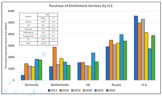 - U.S. Energy Information Administration. 2023; 2022 Uranium Marketing Annual Report, Table 16. Available online: https://www.eia.gov/uranium/marketing/table16.php (accessed on 8 May 2023).