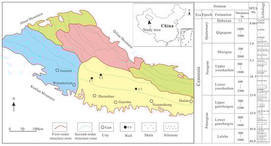 The Qaidam Basin is a multiphase sedimentary basin with a complex geological background [17]. In geological history, the basin has undergone many tectonic movements and magmatic activities, resulting in complex geological structures and rich sedimentary rocks [18]. The strata in the basin are mainly divided into Precambrian, Cambrian, Ordovician, Silurian, Devonian, Permian, Jurassic, Cenozoic, and other strata from bottom to top [19]. Among them, the Quaternary is the latest formation in the Qaidam Basin, which is mainly composed of shale, sandstone and other rocks, and is one of the most important sedimentary layers in the basin (Figure 1).