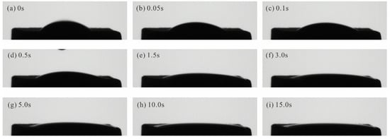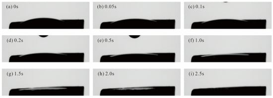 Because of the particularity of its microstructure, the wettability of shale shows some unique characteristics. Wettability refers to the distribution of the liquid on the solid surface, and the more evenly the liquid is distributed on the solid surface, the better the wettability [37]. For shale, its microstructure is mainly composed of quartz, feldspar, mica, and other minerals, and the surface of these minerals has certain chemical properties and structural characteristics, which affects the wettability of shale. The water contact angle refers to the angle between the contact line formed when the liquid is in contact with the solid and the solid surface [38]. The wettability of the shale surface can be judged by the size and variation of the contact angle.