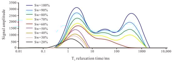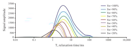 NMR characteristics of silty shale under different water saturation conditions. The peak value of the T2 spectrum is usually between a few milliseconds and a few hundred milliseconds. As the water content increases, the T2 spectrum peak gradually decreases.