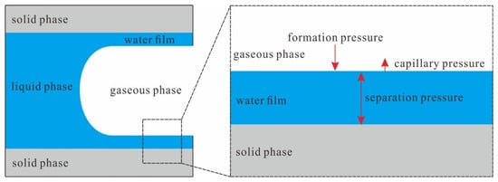 Pore water forms a water film on the pore surface, which is usually from a few nanometers to tens of nanometers in thickness. The thickness of the pore water film is related to factors such as porosity and rock particles [46]. The calculation of water film thickness in pores involves concepts such as capillary pressure, formation pressure, and separation pressure (Figure 7). The water film thickness decreases with the increase in formation pressure, showing a negative correlation trend. This is because the increase in formation pressure will compress the water molecules in the pores, making their distribution more dense, thus reducing the thickness of the water film [47]. The water film thickness presents a nonlinear trend with the increase in formation pressure, that is, the change rate of water film thickness gradually slows down. This is because when the formation pressure is small, the water molecules in the pores are subjected to relatively small compression, and the water film thickness changes rapidly. However, with the increase in formation pressure, the water molecules in the pores are gradually saturated by compression, and the change rate of water film thickness gradually slows down.
