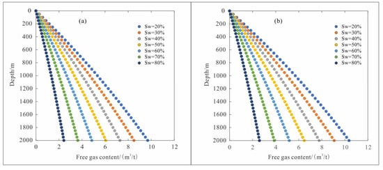 Variation trend of free gas in shale with different water saturation with depth. (a) is clay shale, (b) is silty shale. With the increase in burial depth, the free gas volume increases gradually. With the increase in water saturation, the free gas content decreases gradually.