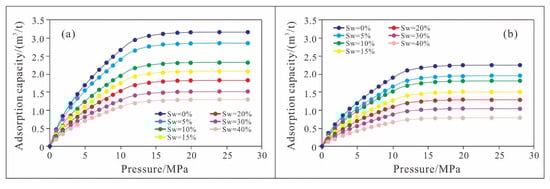 Isothermal adsorption curves of methane in shales with different water saturation. (a) is clay shale with large adsorption capacity. (b) is silty shale with small adsorption capacity.