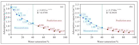 Variation trend of adsorbed gas of shale with different water saturation. (a) is clay shale, (b) is silty shale. With the increase in water saturation, methane adsorption decreases gradually. The methane adsorption capacity of clay shale is higher than that of silty shale.